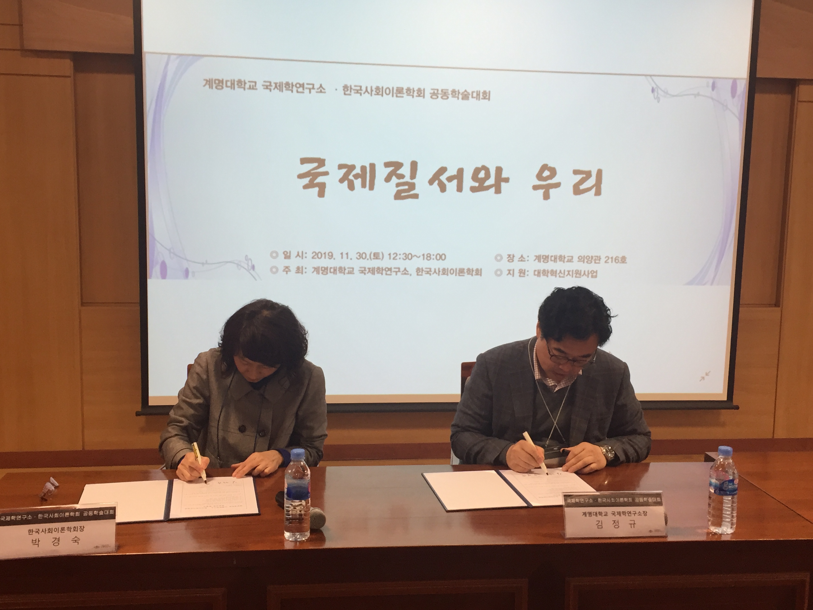 대구 계명대학교에서 개최된 정기학술대회에서 우리 학회는 계명대학교 국제학연구소와 MOU를 체결하여 학문 발전을 위한 상호 협력을 돕기로 하였습니다